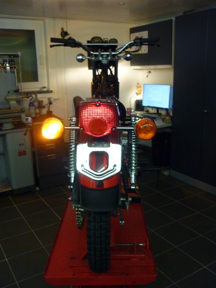 Da das Wetter sich heute mal etwas zusammennimmt, starte ich den Einzylinder. Ohne Choke geht hier garnichts. Anders als meine CB250G will sie auch noch einige Zeit mit vollem Choke laufen, bis die Drehzahl ansteigt. Also fahre ich mal eine etwas unseren weg rauf und runter. Kupplung, Schaltung funktionieren zumindest bis zum 3. Gang einwandfrei. Die vordere Bremse ist zu weich und wird etwas strammer gestellt. Es verabschiedet sich noch eine Blinkerglühbirne, aber sowas hat man ja liegen. Fehlt noch die TÜV Abnahme. Aber das vertage ich gern in den März oder April nächsten Jahres.