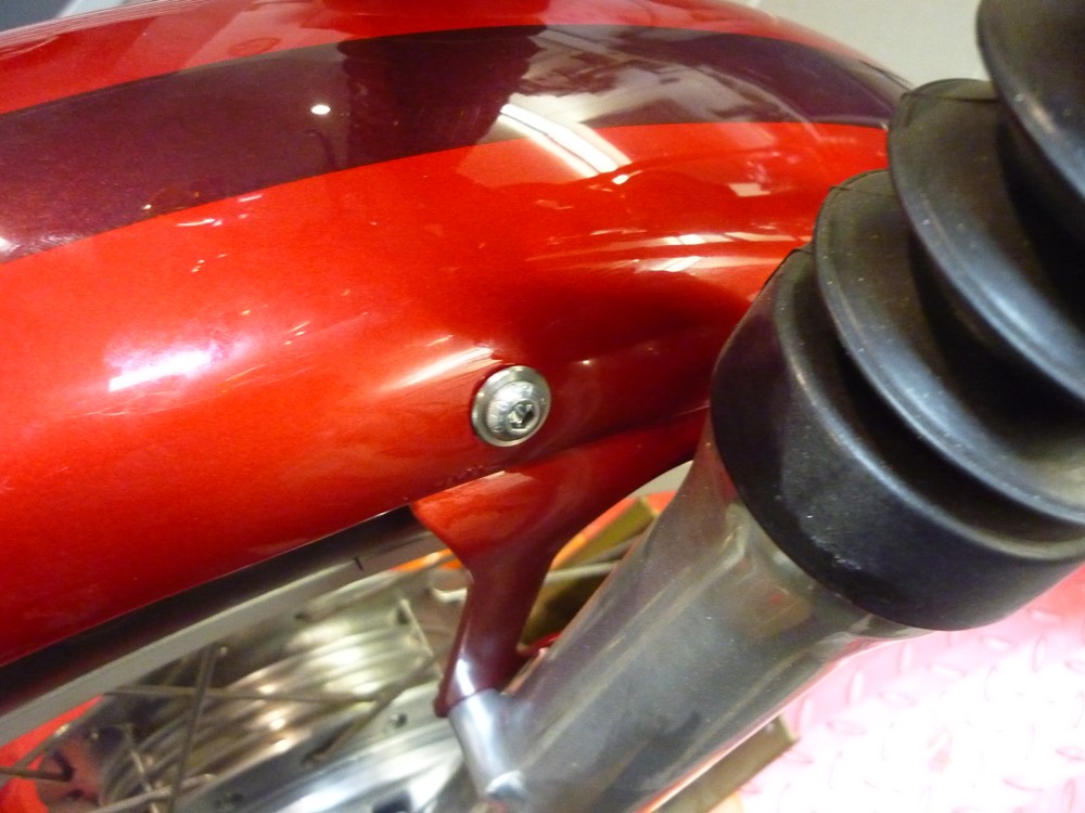 Auf zum Dachboden. Es wird Zeit der Honda mal ein wenig Farbglanz zu verleihen. Meine liebe Frau Steffi hilft mir das kostbare Lagergut unbeschadet durch die kleine Dachbodenlucke zu bugsieren. Bedeckt durch einer dicken Staubschicht ist der schöne Candyrubyred Lack kaum noch zu erkennen. Ich hätte ein Bettlacken drüber legen sollen. Nächstes mal bin ich schlauer. Das vordere Schutzblech muss zuerst wieder mit seinem Halter verbunden werden. Ab Werk waren hier 4 überdimensionierte Popnieten dafür zuständig. So etwas habe ich leider nicht. Ich bin bekennender Fan von Linsenkopfschrauben aus Edelstahl. Ohne Unterlegscheiben möchte ich die Schrauben aber nicht verwenden, da im Kunststoff recht große Bohrungen sind. Karrossieriescheiben sind zu groß und liegen an der Rundung des "Bleches" nicht richtig an Also fertige ich auf der Drehmaschine 4 abgesetzte VA-Scheiben an. Zuerst hatte ich noch die Idee O-Ringe als Lackschoner unterzulegen, aber die Ringe quellen seitlich raus. Also verwefe ich die Idee und hoffe der Lack verzeiht den direkten kontakt mit dem Metall. Die Kabelführungsose wird auch befestigt. Sie wird "festgedübelt". Einen allzu sicheren Eindruck macht das nicht. Eine Schraube wäre mir lieber. Naja, vielleicht hält es ja auch so.