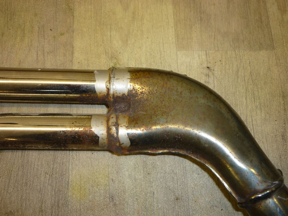 Endlich wieder da! Leider hat mich ein Bandscheibenvorfall von 3 Wochen völlig aus der Realität geknockt. Aber was soll's. es muss irgendwie weitergehen. Zumindest kann ich jetzt mal die Webseite wieder auf Vordermann biringen. Einiges habe ich ja vor Tag X noch gemacht. Zunächst war ich ja noch in dem Glauben, daß ich den orginal Krümmer doch retten kann. Um die Mitarbeiter bei Fa. Kreile ein wenig zu entlasten und die Abarbeitung etwas zu beschleunigen, hatte ich den Plan den Krümmer metallisch blank zu schleifen, alle Rostnaben mit Hartlot aufzufüllen. Ist mir das bei dem inneren Krümmerrohr auch noch recht gut gelungen, musste ich dann doch beim ausseren Rohr die weisse Flagge hissen. Der Rost hatte sich hier so tief in den Stahl gefressen, daß einer Aufarbeitung warscheinlich Tage gedauert oder am Ende doch zu nichts geführt hätte. Hier sprechen die Fotos wohl mehr als tausend Worte.