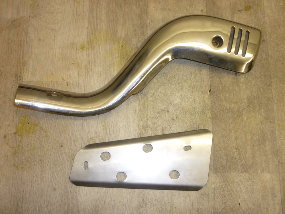Also muss doch den Edelstahlkrümmer der Fa. Leiro ran ans Mopped. Auch wenn er mir nicht wirklich gefällt. Ein anderer gebrauchter Honda Krümmer ist nicht aufzutreiben. Also müssen wir das beste draus machen. Auf gar keinen Fall werde ich die lieblose Hitzeschutzplatte verwenden. Also trenne ich als erstes die Besfestigungsmuttern ab. Diese bestehen übrigens aus verkeht herum angeschweißten Hutmuttern. Der Zweck heiligt die Mittel. Da ich mich eh mehr mit dem Thema WIG Schweißen beschäftigen möchte, ist das wohl jetzt mal die beste Gelegenheit. Dazu bekommt mein Schweißgerät einen zusätzlichen Fussschalter verpasst. Aus 2mm VA Blech und 12mm Rundmaterial fertige ich 2 Halter für den Hitzeschutz und schweiße diese an. Zuvor muss ich aber die Krümmerrohre noch richten, da der Anstand am Zylinderkopf um 8mm nicht passt. Auserdem feht der untere Halter völlig. O.k. man kann sich drüber streiten, ob er erfoderlich ist. Für mich gibt es da aber keine Frage. Was dran war, soll auch wieder dran. Also fertige ich mir diesen Halter auch aus dem 2mm Blech an und schweiße ihn fest. Was hier so einfach klingt, ist real doch eine zeitraubende Arbeit, da ich dafür zunächst eine Pappschablone anfertige, dann das selbe in Blech. Da ich im montierten Zustand unmöglich heften kann muss ich die Lage so gut es irgenwie geht per Edding anzeichnen, dann leicht anheften, wieder anschrauben und nachrichten. Zu guter letzt bin ich aber zufriegen und verschweiße Krümmer und Halter für hoffentlich immer. Tja, nun geht es ans Schleifen und Polieren. Hier kann ich meinen neuen Rohrbandschleifer wenigstens mal auf Herz und Nieren testen. Der Feinschliff erfolgt am Polierbock sowie mit Dremel und Stabschleifer. Das Ergebniss ist nicht perfekt, da man die brutelen Biegemacken und unrunden Rohre eben nicht wegschleifen kann, aber ich bin zufrieden. Vielleicht finde ich eines Tages einen besseren Werkskrümmer. Nun muss aber auf jeden Fall die Werkstatt gründlichst greinigt werden. Ich mag es gern sauber und ordentlich.