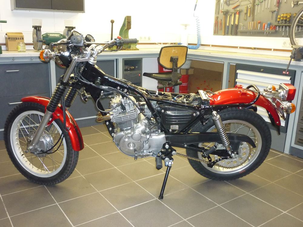 Wirklich schon sehr lang nichts mehr über meine Motorräder veröffentlicht. Was definitiv daran liegt, daß ich jede freie Minute an meiner Werkstatterweiterung arbeite. Trotz allem soll die kleinen Honda nach der langen Zeit als Restaurationsobjekt ja nun endlich wieder auf die Straße. Also hole ich sie an einem sonnigen Tag Anfang April aus der Garage und putze den Winterkonservierer mit Waschbenzin und ein paar alten Handtüchern runter. Im Anschluss bekommt sie einen technischen Check und ich lasse sie kurz laufen. Die Batterie hat die Winterzeit seit Ende November gut überstanden. Zunächst etwas wiederwillig, aber schließlich springt sie an und läuft auch sehr ruhig vor sich hin. Ich bemerke, daß der Choke von allein wieder in seine Ausgangsstellung zurück wandert. Hält man ihn aber mit der linken Hand bis zum Anschlag gezogen startet der Motor deutlich besser. So hat doch jedes Fahrzeug seine Eigenarten. Am "Ostersamstag" lade ich den Leichtscrambler auf meinen Anhänger, schnalle ihn fest und mache mich auf den Weg zum TÜV. Also nicht so direkt zum TÜV sondern zur Vautec. Dort bin ich mit all meinen Fahrzeugen schon so halbwegs bekannt und es ist nur gute 2km entfernt. Leider stehe ich an diesem Samstag vor verschlossenen Tür bzw. verschlossenem Hoftor. Schade eigentlich. Also bleibt die Honda auf dem Anhänger vor der Garage stehen. Auf meiner Arbeit melde ich mich ab und fahre am Dienstagfrüh nocheinmal los. 7.55 Uhr bin ich der erste Kunde auf dem Hof. Der diensthabende Prüfer gehört nicht unbedingt zum meinen Lieblingen, da er immer etwas müffelig rüberkommt. Als er die, in der Sonne glänzende Honda entdeckt, wird seine Laune aber schlagartig besser und er beginnt von seinen ersten Motorrädern zu erzählen. Eine XT250 gefolgt von eine XT500. Die gesamte Untersuchung erzählt er mir von seiner Zweiradkarriere die aktuell mit einer alltags BMW GS 1100 ihr Ende hat. Durch die vielen Startversuche schein die Batterie nun doch schon ein wenig schwach zu sein, so daß die Hupe mehr krächst als hupt. Aber das ist dann auch das einige Manko. Wieder zu Hause angekommen, stelle ich beim Abladen fest, daß sich die vordere Bremse recht weit durchziehen läßt. Da haben sich wohl Beläge und das Bremsseil ein wenig gesetzt. Ab in den Keller und mit ein paar Werkzeugen unter den Arm zurück in die Garage. Der Hebel an der Bremsplatte läßt sich nun um einen Zahn versezten, so daß wieder genug Spiel zum nachstellen vorhanden ist. In den nächsten Tagen radel ichg nach der Arbeit kurz bei meinem Versicherungsmakler vor und hole mir eine eVb Nummer für die Zulassungsstelle. Termine bucht man in Neumünster mittlerweile nur noch online. Die Coronazeit hat auch bei den Behörden so manches verändert. Zum Glück bekomme ich schon am dauf vollgenden Montag einen Termin. Vorbei sind die Zeiten, des langen wartens im überfüllten Vorraum. Die "Sicherheitsfrau" prüft meine Anmeldung. In Vorraus checke ich mich ein und werde promt aufgerufen. Der junge Mitarbeiter auf der Zulassungsstelle wirkt ein wenig überfordert, mit der Aufgabe ein 25 Jahre abgemeldetes Fahrzeug wieder zu zulassen, da er keinen Datensatz zum Fahrzeug aus dem Zentralrechner abrufen kann. Eine erfahrene Kollegin hilft aber tatkräftig aus. Die CL wird sozusagen neu "erschaffen" Gut eine 3/4 Stunde später bin ich mit Brief, Schein und Kennzeichen wieder auf dem Weg zur Arbeit unterwegs. Einige Tage vorher hatte ich bei ebay eine Nummerschild Verstärkungsplatte aus 3mm Alublech geordert. So etwas finde ich recht sinnvoll, da man deutlich mehr Möglichkeiten hat, die Schauben so zu setzen, daß sie nicht in den Nummern landen. Ausserdem sind die Nummernschilder für meinen Geschmack alles andere als stabil, dafür aber recht teuer. So kann ich am Mittwoch dieser Woche nach Feierabend die Platte und das Kennzeichen am Mopped befestigen. Hierzu verwende ich wieder meine lieblings Edelstahllinsenkopfschrauben. Nicht gerade einfach an einem Zweirad ohne Mittelständer, das Kennzeichen gerade anzuschrauben. Mir sticht einmal wieder ins Auge, daß die Sitzbank an den hinteren Haltern nicht so wirklich mittig zum Rahmen sitz. Diesen Schönheitsfehler hatte ich bisher mehrfach versucht zu ignorieren. Gelingt mir aber nicht. Da muss ich die Tage noch einmal bei. Aber am kommenden Wochenende möchte ich gern eine ausgiebige Probefahrt machen und die üblichen Einstellarbeiten durchführen.