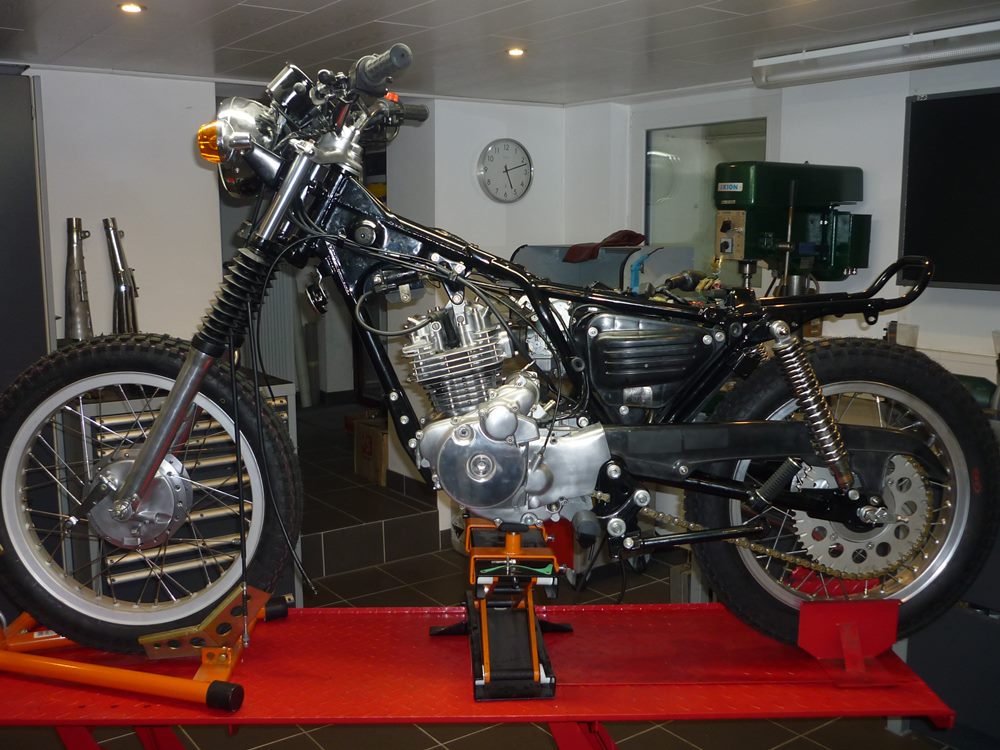 Schon vor längerer Zeit war mir beim Stöbern auf der Seite von CMSNL aufgefallen, daß die XL250S an der Schwinge auf der Unterseite einen Metallbügel hat. In meinem Werkstattbuch ist der nicht abgebldet, aber die Gewindefür die Befestigung dieses Teils sind vorhanden. Also hab ich es mal mit bestellt. Auf der Rückseite der Schwinge wird er an der Schraube der Fussraste befestigt. Hier muss ich allerdings die aufgeschweisste M8 Mutter vom Halter mit einem Flachsenker entfernen, weil die Fussraste mit M10x1.25 befestigt wird. So kann ich das Ding aber nicht verbauen. Die Kanten sind grottenschlecht entgratet worden. Entsprecht ist die Lackschicht an den messerscharfen Kanten auch nicht wirklich schön. Also muss der Dremel wieder arbeiten und die Kanten verrunden. Die Bohrungen fase ich mit einem Spitzsenker an. Dann wird das Teil angeschliffen und neu lackiert. Weider beobachte ich das merkwürdige Phänomen, daß der Lack aus der Spaydose nach dem Trocknen anstelle von Schwarz eher graubraun wird. Heftiges und langes schütteln vermindert diesen Effekt. Ich mag Spraydosenlack irgendwie nicht. Naja optisch fällt der Fehler nicht allzusehr auf, also wird das Teil angebaut. im Grunde bin ich mir über die Funktion von den Schutz auch nicht wirklich im Klaren. Soll es das Bein des Fahrers vor Kettenkontakt schützen? Oder die Kette vorm Eingraben im Schlamm? so richtig einen Sinn macht es nicht, sieht aber wichtig aus.