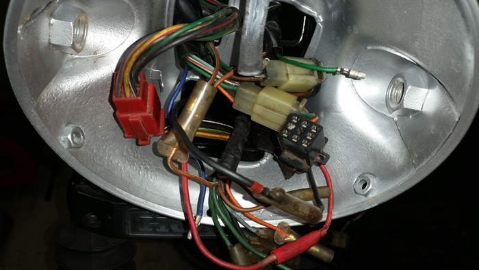 Der nicht funktionierenden Elektrik wollte ich auch auf den Grund gehen. Im vorderen Scheinwerfer waren zwar viele Kabel, aber nicht alle mit einander verbunden. Ok. das erklärt einiges. Da der Lampentopf und Ring silber lackiert waren, machte ich mich auf die Suche nach einerm neuen verchromten Scheinwerfer. Für diese Motorrad findet man wirklich wenig gute gebrauchte Ersatzteile und gar keine neuen Teile. Selbst der Ersatzteilegigant aus Holland hat nicht einmal eine Rubrik für die CL250S. Zum Glück fand ich bei Kedo eine Scheinwerfer, der dem werksseitigen sehr ähnlich kam. Der rostige Lenker wurde gegen einen ebenso verchromten von Fehling getauscht. Dazu gab es noch neue Blinkerkappen. Viele Teile von der CB250RS und der XL250S sind zum Glück identisch.