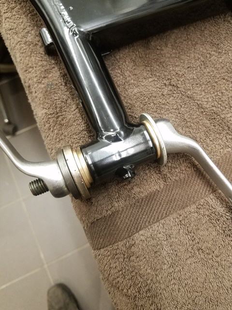 Der Zusammenbau der CL beginnt mit der Vormontage der Schwinge. Werksseitig ist die Honda mit Lagerbuchsen aus Kunststoff ausgerüstet. Diese waren entweder schon etwas verschlissen oder gehörten so klapperig. Mir gefiel das nicht. Ausserdem hatte ich keine Lust auf einen TÜV "Beamten", der Lagerspiel moniert. Da meine Drehmaschine noch in der Garage vor sich hin vegetierte, bat ich meinen guten Freund Udo mir 4 Lagerbuchsen aus Bronze anzufertigen. Udo war bei einer kleinen aber feinen Zerspanerbude in der Nähe beschäftigt. Ich kannte ihn schon aus der gemeinsamen Ausbildungszeit in der Neumag. Leider ist er vor kurzem bei einem Motorradunfall um Leben gekommen. :-(