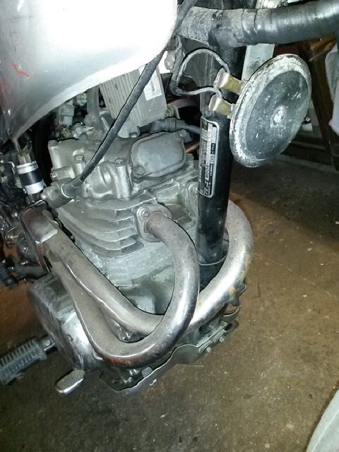 Die Bolzen wollen irgendwie auch nicht so richtig passen. Wenn ich nicht wüsste, daß ich ihn aus genau diesem Rahmen ausgebaut hätte, würde ich ja sagen.... Aber was soll's. Er muss passen. Nach vielen hin und her, dem Einsatz von Spannriemen und kleinen Holzkeilen sitzen alle Halteplatten und Bolzen an ihrem Platz. Die Uhr sagt mir, daß es fast 4 Stunden gedauert hat. Wahnsinn. Meine Frau meinte schon öfter, warum ich mein Geld nicht mit Moppedschrauben verdiene und mich selbstständig mache? Wer würde das bezahlen wollen? 4 Stunden für die Montage eines Motors. Zu guter letzt hake ich noch die Feder des Seitenstäders ein. War gar nicht so schwierig. Das hätte auch mal eine vorher sagen können. ;-)