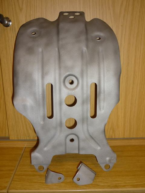 Es gibt ja leider manchmal Dinge, die könnten so einfach sein und am Ende macht man sich die doppelte Arbeit. So auch mit der Motorschutzplatte. Eigentlich könnte ich sie auch so wieder anschrauben, wie sie ist. Drunter guckt eh keiner, aber nun ist alles frisch gemacht, dann muss auch die Motorschutzplatte aufgefrischt werden. Also entferne ich die Buchsen und Gummiteile, schleife ich die alte Lackierung gut an, entfette alles mit Verdünnung. Nach 2 Schichten Grundierung, 3 Schichten Felgensilber sieht die Platte wieder richtig schön aus. Zum Schutz des Silberlackes spühe ich noch 2 Schichten Klarlack auf. Da ich keinen normalen Klarlack mehr habe nehme ich dafür Motorthermoklarlack. Frag mich mal einer warum, aber der verfluchte Klarlack will einfach nicht richtig durchtrocknen. Nach 3 Tagen beschließe ich die Platte bei 80° im Backofen trocknen zu lassen. Nach einer Stunde im Ofen und einer Abkühlphase klebt der Lack immer noch wie ein Fliegerfänger. Langsam werde ich gallig. 20 Minuten bei 220° steht auf der Spraydose. Na, wenn das man der Silberlack ab kann. Naja viel zu verlieren habe ich nicht. Natürlich schlägt der Silberlack bei 220° heftige Blasen und wie kann es anders sein: Der KLARLACK klebt immer noch. Also alles noch einmal von vorn, wenn ich dazu mal irgendwann Lust habe. Erst einmal nicht. Abends bestelle ich mir aber silbernen Pulverlack und Klarlack. Von Spraylack habe ich die Nase gestrichen voll.