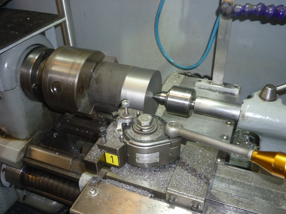Mit dem Kauf der Maschine habe ich auch eine mitlaufende Zentrierspitze miterworben. Die Spitze verhunzt und die Lagerung fest. So lag sie diverse Monate auf meiner Werkbank. Eigentlich wollte ich sie entsorgen, weil ich mir eine neue für die Maschine gekauft hatte, aber sie ist so schnuckelig klein. Das kann bei dünnen Werkstücken ja durchaus praktisch sein. Also wird sie zerlegt, das Nadellager von der Rückseite freigebohrt und ausgeschlagen. Im Prinzip ist alles technisch o.k. nur vollig verschmutzt und verharzt. Das Rillenkugellager bestelle ich trotzdem neu. Die Spitze wird in der Drehmaschine nachgeschliffen. Zum Verschluss der Rückseite drehe ich einen Stopfen aus POM. Was allerdings eine blöde Idee ist, da in die D12mm Bohrung genau die Spindel des Reitstocks passt und sich die Spitze somit nicht mehr aus dem Morsekegel lösen läßt. Also fertige ich einen zusätzlichen, abgesetzten Stopfen aus Stahl an, der sich an der Fase abstützt. Das Gehäuse wird noch ausgiebig mit Schmirgelleinen bearbeitet. Naja ihr Leben sieht man ihr trotzdem noch an, aber egal. Die nächste Aufgabe ist deutlich herausfordernder. Der Spindelkonus der Maschine hat im Laufe des Lebens der Maschine ein wenig gelitten. Die Planfläche hat ca. 0,015mm und der Konus 0,02mm Schlag. Mit der selben Technik wie bei der Zentriespitze schleife ich beide Flächen nach. Zuvor habe ich natürlich den Oberschlitten parallel zum Konuswinkel ausgerichtet. Eine verdammt kribbelige Aufgabe das ja beide Flächen in ein definierten Verhältniss zueinander bleiben müssen. Nach gut 1 Stunde schleifen bin ich mit dem Ergebniss zufrieden. Der Konus liegt bei 0,005mm und die Planfläche bei 0,0075mm. Das 200er Futter sitzt gut und spielfrei im Konus. Leider hatten die Hartbacken selbigen Futters auch schnon ein wenig gelitten. Zum Ausschleifen der Backen müssen diese natürlich leicht gespannt sein. Hier hatte mein Freund Lars einen guten Tip für mich. Ich durchbohre mit einem VHM Bohrer D6.3 die harte Randschicht der Backen und kann dann ein Kernloch und M6 Gewinde in die Backen bohren. In die Gewinde kommen 3 Inbussschrauben rein. So kann ich die Backen an einem zuvor angefertigten Ring leicht spannen und die Backen ausschleifen. Nun kommen wir zum eigentlichen Sinn der ausgeschliffenen Backen. Ich spanne eine 60° Spitze in Futter und Reitstock. Dazwischen wird eine 450mm lange gehärtete und geschliffene Messwelle gespannt. So kann ich den Reitstock genau einjustieren und auch die Höhe des Reitstocks überprüfen. Mit 0,04mm ist er zwar ein bißchen höher als die Spindelmitte, aber damit kann ich leben. Zuletzt überprüfe ich auch noch mal die Paralellität des Spindelkastens zum Bett. Die sieht aber auch gut aus. Desweiteren habe ich 2 Halter für die nötigen Schlüssel aus 4mm Alublech angefertigt und an der linken Abdeckung verbohrt und verschraubt. Ordnung muss sein. Siebdruckplatten für die Drehstahlablage habe ich auch schon gekauft. Dazu dann im nächsten Kapitel.
