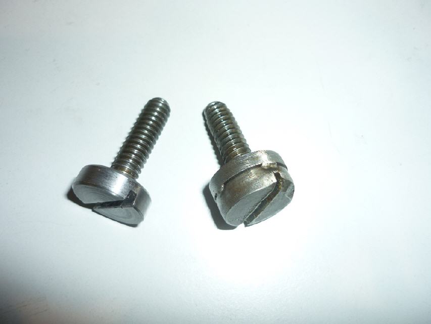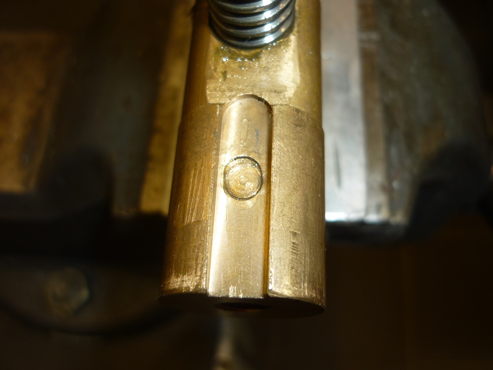 Unter dem Spindelkasten gibt es diese Verstelleinheit mit der man den Kasten parallel zur Führung ausrichten kann. Per Zufall fällt ein Stift beim Umdrehen des Kastens raus. Vorn an der Verrundung hat er eine Macke. Neugierig geworden, drehe ich die Stellschrauben raus. Sie gehen reichlich schwer und sind vorn am Gewindeanfang leicht angefressen. Für meinen Ingenieursverstand sollten hier 2 45 Grad Flächen aufeinander treffen, aber nicht eine Kugel und eine fast stumpfe Schraube. Das geht besser. das Gewinde im Block bohre ich auf M8 auf. Aus 8mm Rundmaterial drehe ich 2 neue Druckstücke. Die Führungsbohrungen reibe ich mit einer 8H7 Reibahle wieder zylindrisch auf. Komisch, bei fast allen Schrauben verwenden die Engländer Zoll. Die Durchmesser der Dreh und Frästeileteile hingegen sind Metrisch. Alle Kugellager sind nach Normreihe. Wedis z.B. mal metrisch, mal in zoll. Nun gut. Sie sind halt etwas anders als "normale" Menschen. Nun benötige ich noch 2 M8x25 Gewindestifte nach DIN914. Ebay kann liefern. 2 Kleinigkeiten kommen noch in diesen Absatz. Ein Aluminumgehäuse entlacke ich und bohre die BSW "M6" Gewinde auf M8 auf, damit ich Abdruckschrauben aus meinem Lager verwenden kann. Die werksseitigen Schrauben fehlten hier. Dann muss ich noch eine Scheibenfeder anfertigen, da ich eine bei der Demontage vermurkst habe. Normal ein Centartikel. Diese hier haben aber Zollabmessungen. Also drehe ich einen passenden Durchmesser und steche ihn 25.4/8=3.2mm breit ab. Säge und Feile bringen ihn in Form. Inselaffen.....