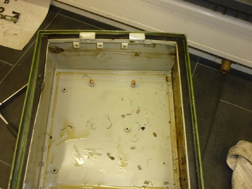 Widmen wir uns mal dem nächsten Sorgenkind. Dem Schaltschrank. Er hat aus irgendeinem Grund arg gelitten. Der Hauptschalter ist gebrochen bzw. fehlt zum Teil. Die Türschaniere sind völlig verbogen, einige Schütze sitzen nicht mehr richtig auf den völlig verbogenen Hutschienen. Eigentlich ein Wunder, daß sie noch so funktionierte. Da mein Bruder Frank mir beim Neuaufbau behilflich ist, werden alle Komponenten herausgenommen. Das geht auch garnicht anders, da mein neues Hauptschalter um einiges größer ist, als der alte. Tür, Gehäuse, Schaniere und die Hutschienen werden gerichtet. Die Hutschienen montiere ich auf einen seperaten Grundplatte. So gewinne ich mehr Tiefe und man kann ausserhalb des Gehäuses vorverkabeln. Der neue Hauptschalter wird schon mal vorab eingebaut und an die Gehäusetiefe angepasst. Er bekommt eine zusätliche Befestigung an der Aussenseite des Gehäuses. Das schaut schon mal ganz gut aus. Beim Reinigen der Komponentnen, fällt mit auf, daß beim Schütz des Haupmotors die Nasen für die Hutschienenbefestigung herausgebrochen ist. Also bestelle ich ein neues. Nicht ganz so einfach wie gedacht. Die Maschine besitzt keinen separaten 24V Steuerstrom. Nach einiger Suche finde ich ein geeignetes Schütz von Siemens. Im Übrigen sind fast alle Schaltbauteile der Maschine von Klöckner Möller. 1980 hatte Made in Germany wohl noch einen guten Ruf. Der Schaltschrank kommt auch in die "Lackierabteilung". Als nächstes beginne ich mal mit der KSS Versorgung. Leider fehlte sie bei der Maschine komplett, aber zum Glück habe ich da noch was liegen. Bei meiner Leinen hatte ich damals auf eine Mindermengenschmierung umgerüstet. Tank und Pumpe werden aus dem Lager geholt und an die neue Deutsch / Englische Vereinigung angepasst. Den Tank muss ich um 70mm in der Höhe kürzen. Ebenso bekommt er auf dem Deckel eine Umlenkwand für das zurückfließende Wasser. An der Maschine muss ich Sammelrinne ca. 20mm höher neu verbohren. So passt es. Der Tank bekommt einen 1/2" Ablaufstutzen. Ich denke, daß wird mir den Wasserwechsel etwas erleichtern. Ebenso löte ich 2 Stück 15mm Kupferbögen ein. Diese werden später mit einem transparenten Schlauch als Wasserstandsanzeige verbunden. Beim abschließenden Reinigen des Tankes fällt mir leider etwas Lochfraß im Boden auf. Also wird noch mal etwas geschweißt. Zum Schutz bekommt der Tank einen Anstrich mit Tanklack, den ich noch von der Bauer übrig hatte. Ich hoffe, daß Zeuge ist resitent gegenüber KSS. Als nächstes demontiere ich die KSS Pumpe. Allerdings erst nach dem ich sie provisrisch mit 400v versorgt haben. Der Motor läuft. Eigentlich ein Wunder. Die Pumpe müsste von 1962 stammen. Also 61 Jahre alt. Es handelt sich übrigens um eine Brinkmann Pumpe. Ich will ja nicht schon wieder zu Nationalstolz rüber kommen, aber das ist einfach noch Qualtät. Das Schaufelrad ist aus Bronze, die Motorlager sind von FAG. Bis auf die Motorisolierung ist an dem Teil alles aus Metall. Ich zitiere hier gern mal den älteren Herren von der Harzer Bikerschmiede. "Was lange hält, rettet die Welt".