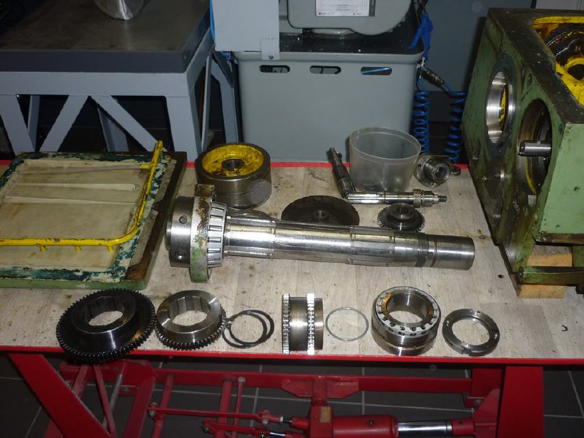 Wie schon angekündigt widme ich meine Aufmerksamkeit als nächstes den Spindelkasten. Reinigen und lackieren ist klar, aber ich möchte auch alle Simmerringe und alle Standartlager erneuern. Wenn möglich auch die Lamellen der Doppelkupplung. Ausserdem hatte ich beim Reinigen des Öltankes eine kleine Druckfeder gefunden. Diese muss auch dem Spindelkasten kommen. Vielleicht schaffe ich es ihren Ursprungsort wiederzufinden. Ebenso mussen die Gewinde des Deckels repariert werden, da sich einige Schrauben nicht mehr festziehen lassen. Zunächst schraube ich aussen alle Schilder, Hebel, die Riemenscheibe und die kleinen Deckel ab. Dann wird der große Deckel, eine Zwischenplatte aus Plastik und die Ölverteilung entfernt. Viele Technik im Kasten und auch viel Ölschlamm. Beim studieren der Getriebefunktion fällt mir auf, das die große Schalttrommel an der hinteren Nut einige Macken hat. Evtl. ein älteter, bereits reparierter Defekt. Dem werde ich aber trotzdem auf den Grund gehen. Der Wellendichtring der Eingangswelle läßt sich sehr einfach wechseln, da er sich in einem seperaten Deckel befindet. Das Lager zu wechseln wird schon schwieriger. An den Wedi. des Vorschubantreibes ran zu kommen geht eigentlich nur wenn man die Welle mit samst ihres Lagergehäuses demontiert. Also Ärmel hoch und los. Die Schaltwellen lassen sich relativ einfach ausbauen. Die schmale Nutenscheibe läßt sich leicht entfernen. Schwirig wird es beider dicken Trommel. Egal wie ich sie auch hin und her drehe. Ich bekomme sie einfach nicht raus. Es nützt nicht, die Arbeitsspindel muss auch raus. Naja so habe ich es deutlich einfacher den Kasten von innen zu reinigen und kann die Lager reinigen und inspizieren. Nachdem ich die hintere Spannmutter, die vordere Abdeckung entfernt habe und 3 große Sprengringe aus ihren Nuten gefummelt habe, läßt sich die Welle aus dem Gehäuse klopfen. Vorn hat die Maschine ein mächtiges Kegelrollenlager mit einem Durchmesser von 125mm. Respekt. Um die Vorschubantriebswelle raus zu bekommen muss ich noch 2 andere kleine Hilfswellen ausbauen. Nun läßt sich auch die Schalttrommel herraus winden. Der eine Umlenkpunkt der ersten Schaltgebel wackelt mächtig. Das ist der Hebel der von der Nut mit den Macken gesteuert wird. Um die Ursache des Wackelns zu Untersuchen, müßte ich den Spindelkasten auf den Kopf stellen. Das mache ich später. Erstmal widme ich mich der Kupplungswelle. Sie rauszubekommen ist eigentlich auch einfacher als ich gedacht habe, wenn man erstmal verstanden hat, wie es geht. Beim ausbauen der Fliehkraftbremse, fällt mir auf, daß der Nutenstein, der die Bremstrommel mit der Welle verbindet fehlt. Hm???? Beim Reinigen des Gehäuses finde ich ihn im Grund wieder. Es aber noch fehlt ein Sprengring. Die Feder aus dem Öltank kann ich auch zuordnen. Sie gehört zur hinteren Spindellagerung. Hier fehlt eine Feder. Hätte nicht gedacht, daß mir das so einfach gelingt. Warum das hintere Lager diese Federn hat will sich mir aber nicht so 100% erschließen. Als nächstes bohre ich alle 8 Gewinde der Deckelbefestigung auf Ø6.3mm auf, schneide M6 Heli-Coil Gewinde und setzt Gewindebuchsen ein. Dazu muss ich mir aber erstmal ein Eindrehwerkzeug aus eine M6 Inbussschraube anfertigen. Wenn man so eine 1/4 Zoll BSW Schraube neben eine M6 legt muss man beim den BSW Schrauben zwangsläufig an Holzschrauben denken. Als nächstes werde ich dann wohl mal alles was zum und in den Kasten gehört gründlich reinigen und Aufarbeiten sowie die losen Bolzen auf der Unterseite untersuchen. Ersatzlager, Wedis und Sprengringe bestelle ich bei Ebay. Kupplungslamellen frage ich per Mail bei Wolfbeisz an. Bin gespannt. Wird bestimmt nicht ganz günstig.