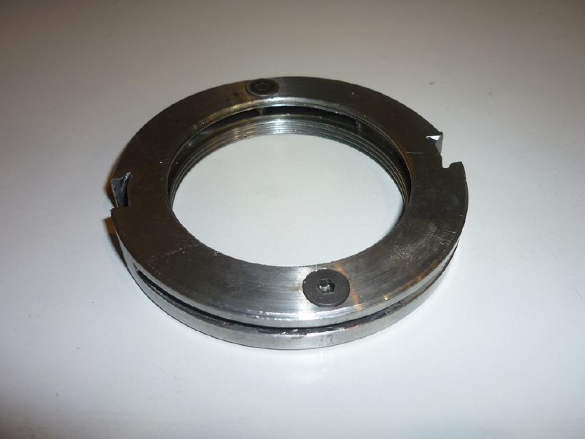 Widmen wir uns mal der Spindel an sich. Leider bekomme ich den Innemrng des vorderen Lagers nicht von der Welle. hier will ich auch kein Risiko eingehen. Es handelt sich um Sonderlager die weit über 1000€ pro Satz kosten. Also bearbeite ich das Gehäuse so gut es irgendwie geht mit Schmirgelscheibe und Schleifvlies. Ein Verschlussbolzen des Camlock Systems geht sehr schwer zu drehen. Leider läßt auch dieses nicht demontieren, da die Sicherungspins in den Bohrungen fest gerostet sind. Eine intensive Behandlung mit WD40 und Öl bingt leider keine Abhilfe. Ausbohren lassen sich die Pins auch nicht da sie gehärtet sind. Am Ende bekomme ich den Verschlussbolzen mit viel Öl und leichten Hammerschlägen von aussen und innen aber wieder akzeptabel gangbar. Zuletzt bearbeite ich noch die Klemmmutter für die Lagereinstellung. Diese sieht echt grausam aus. hier hat ein "Techniker aka Grobschmied" wohl mal die Mutter mit Hammer und Meissel festgezogen oder gelößt. Und das wohl auch nicht nur einmal mit. An eine neue Mutter ist auch nicht zu denken, da nicht metrisch.